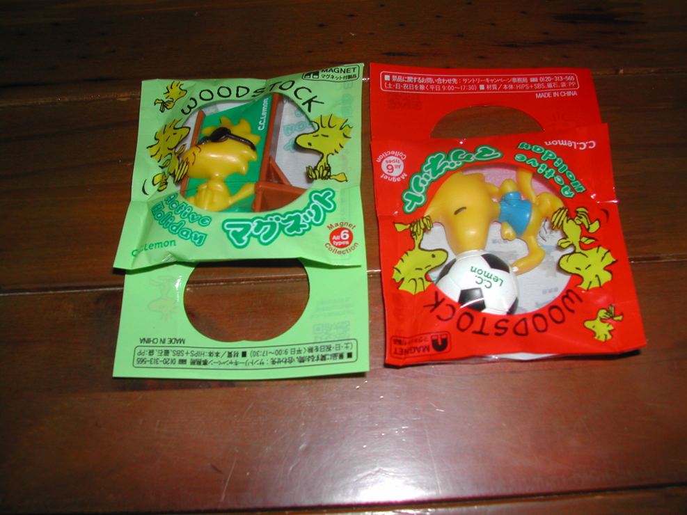 …といいながら今回のおまけはウッドストックの、キャンプ・日光浴・観覧車・飛行機・サーフィン・サッカー、全6種のマグネットですべて集めるつもりだったけど、100均に並ぶのは発売よりずっと後のほうで在庫が無くなれば終り…ということで3個しか手に入らなかった。